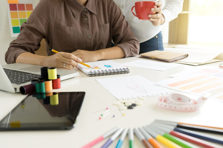 若いファッションデザイナーは テーブルやグラフィックデザイナーの上に生地の布で作業します の写真素材 画像素材 Image